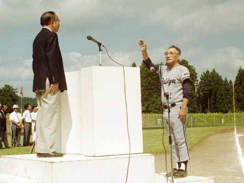第3回大会(昭和56年)試合中急病で倒れた選手がおり、 先生の適切な応急措置をもって一命を取り止めたことがありました。 その時の安堵した本部役員方の顔も忘れられません。 下山賢次先生のボランティア精神は絶対忘れてならないことです。 京都500歳野球連盟とのお付き合いの橋渡し役も高橋政泰氏であります。 京都500歳野球の大会要項の基本は秋田の全県500歳野球のものであります。 関西地区(出身校別のチーム編成)でも年々チーム数が増加しております。 旧神岡町が情報発信源になり、近年は京都府のみならず、 岩手県、神奈川県、宮城県などからそれぞれの優勝チームと 秋田県優勝チームと試合をしていただきたいとの申し込みもあり、 今後の嬉しい課題の一つになっております。 第一回大会から大会総務をしております 大仙市野球連盟神岡支部 理事長 伊藤 久 完